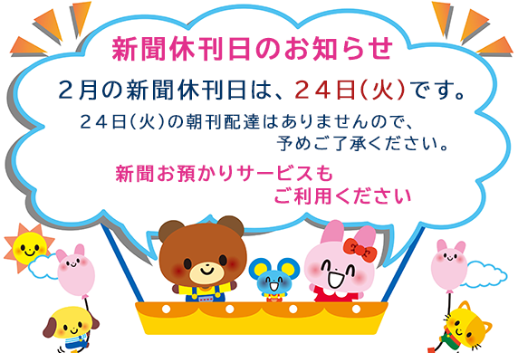- 2月の新聞休刊日は、24日(火)です。ご利用ください 新聞お預かりサービス