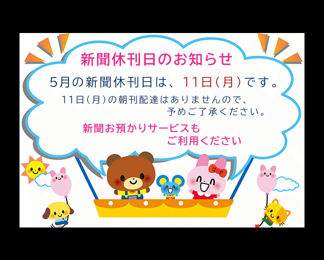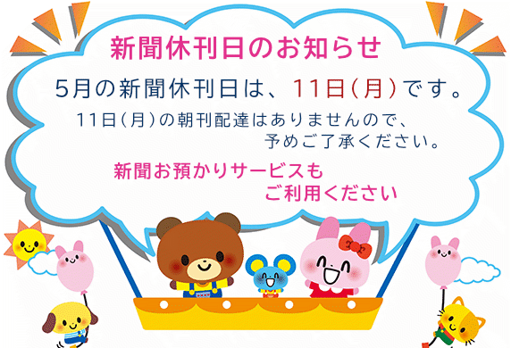 5月の新聞休刊日は、11日(月)です。ご利用ください 新聞お預かりサービス